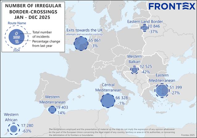 In a statement accompanying the data, Frontex said the figure represents the lowest annual total since 2021 and less than half the level recorded in 2023, but stressed that migration pressures remain volatile and can shift rapidly between routes.