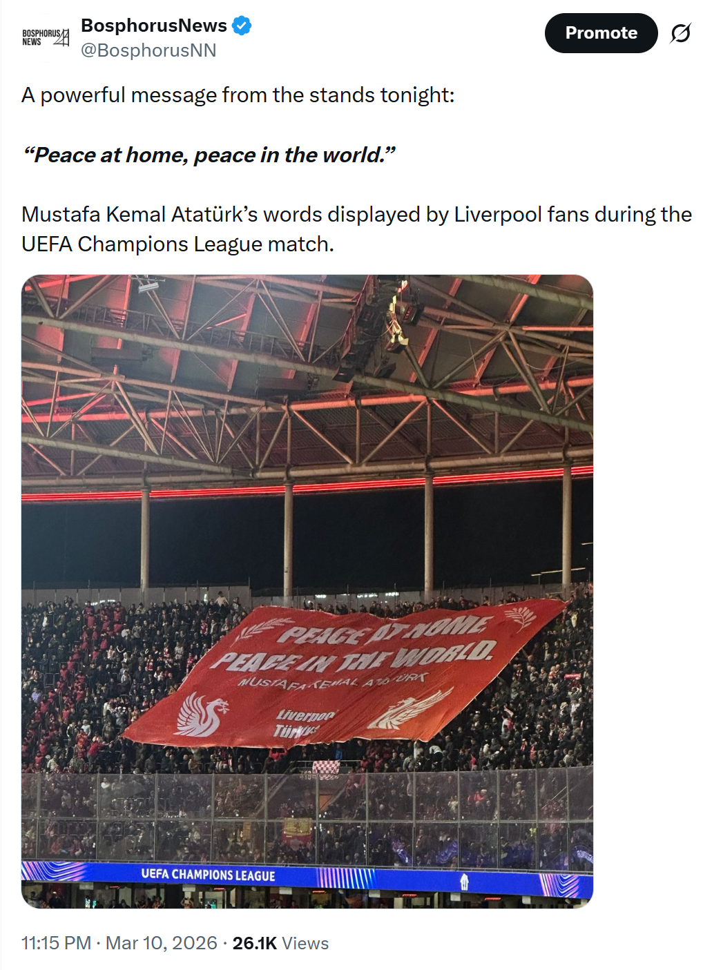 The night also carried a political and emotional undertone in the away end. A large banner displayed by Liverpool supporters carried Mustafa Kemal Atatürk’s words, “Peace at home, peace in the world,” a message that stood out amid the intensity of a Champions League knockout match. The image circulated widely after the final whistle and added a striking visual moment to an already charged evening.