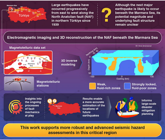 Using three-dimensional electromagnetic imaging, the team mapped variations in the electrical properties of rocks along the North Anatolian Fault beneath the Sea of Marmara. According to the researchers, zones with higher electrical conductivity are likely linked to fluid-rich areas, which can weaken fault strength and influence how ruptures initiate.
