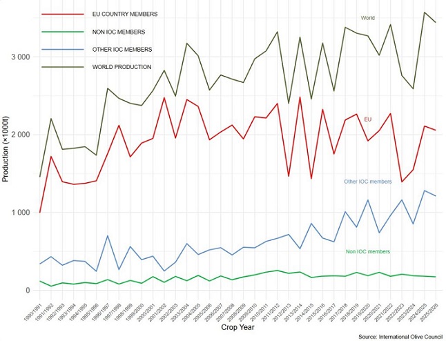 IOC data show global olive oil production rising from approximately 2.59 million tonnes in 2023/24 to around 3.57 million tonnes in 2024/25, a year-on-year increase of nearly 40 percent. For 2025/26, production is forecast at about 3.44 million tonnes, signalling a modest correction but still well above recent drought-affected averages.