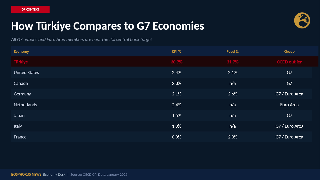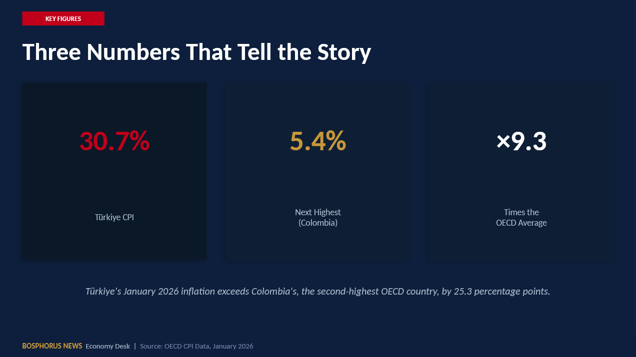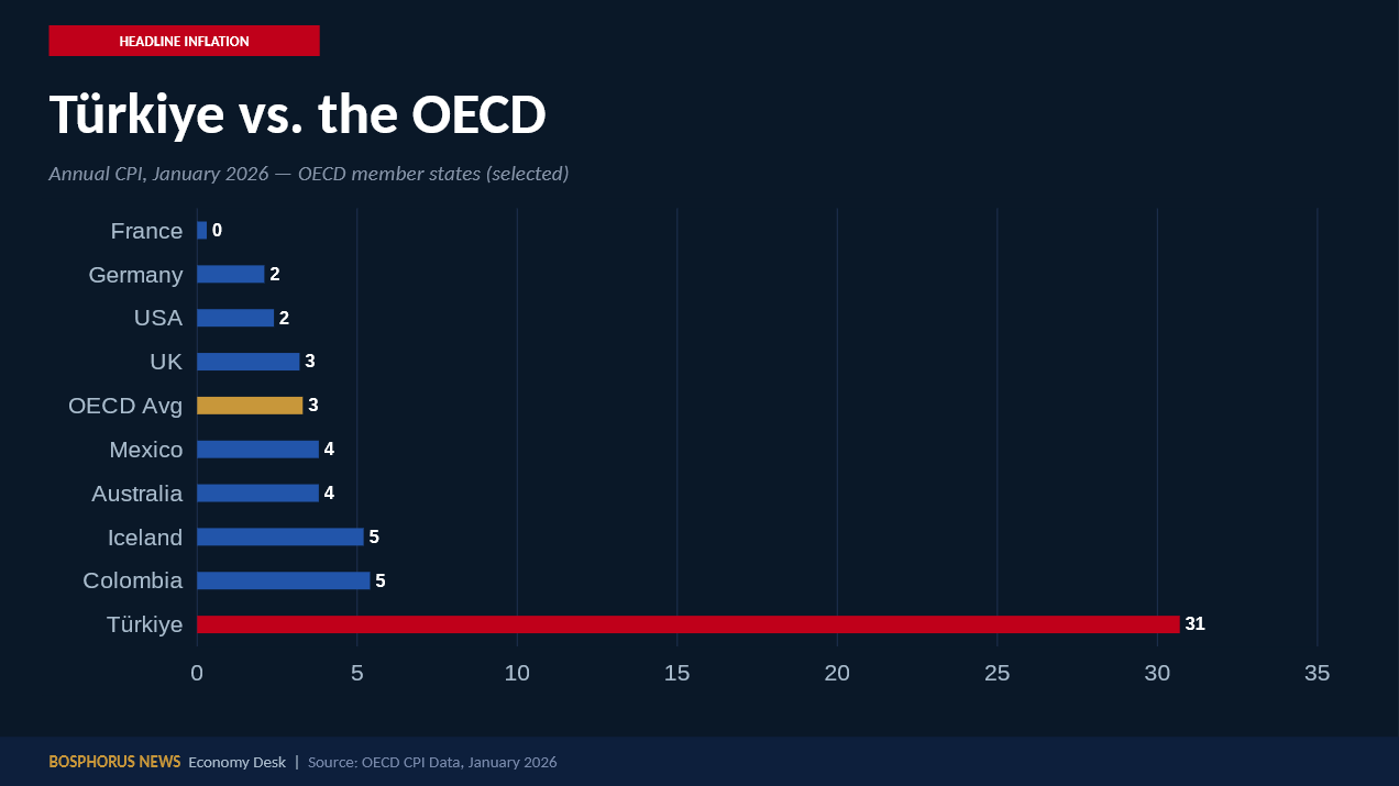 Türkiye ended January 2026 with annual inflation running at 30.7%, according to Consumer Price Index data published by the Organisation for Economic Co-operation and Development (OECD); a rate more than five times higher than the next-closest member state and nearly ten times the group average.