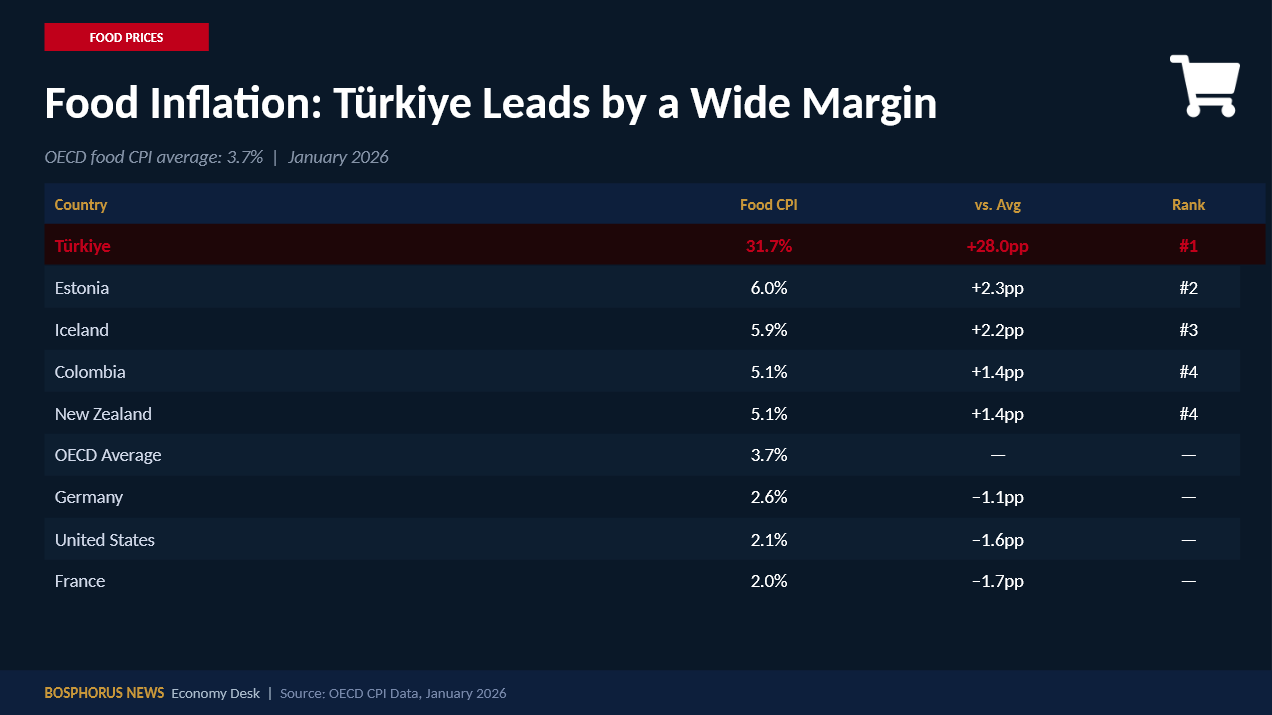 The separation is not confined to headline figures. Türkiye recorded the highest food inflation in the OECD at 31.7%, against a group average of 3.7%. Estonia, in second place, registered 6.0%; less than a fifth of Türkiye's rate. Iceland (5.9%), Colombia (5.1%) and New Zealand (5.1%) rounded out the top five.