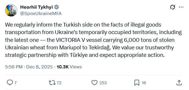 Ukraine's Foreign Ministry has formally alerted Türkiye about the Russian-flagged cargo ship MV Victoria, loaded with approximately 6,000 tons of grain allegedly plundered from occupied Mariupol and heading toward Turkish ports. Kyiv claims the vessel departed the Russian-controlled Ukrainian port on December 8, 2025, carrying stolen exports—echoing similar disputes since 2022 when Ankara intercepted dubious cargoes under the Black Sea Grain Initiative. Official confirmation comes straight from Ukraine's MFA spokesperson on X stating Türkiye was notified and action expected. EMPR Media and NV.ua report Kyiv sanctioned 56 such vessels earlier this year for illegal hauls from Crimea/Mariupol.